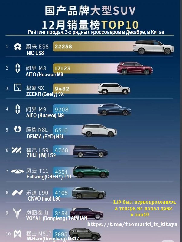 Рейтинг продаж 3-х рядных кроссоверов в Декабре, в Китае