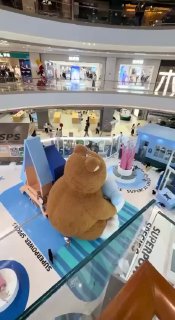 В одном из торговых центров Китая кот забрался на большого плюшевого медведя и удобно там расположился.